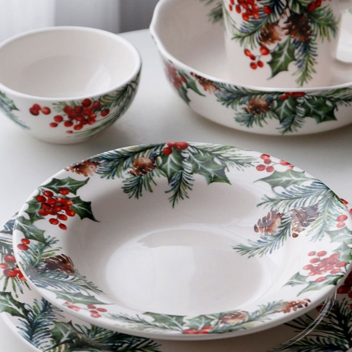 + Free Shippingเติมเต็มบรรยากาศแห่งความสุขในช่วงคริสต์มาส ด้วยชุดจานชามเซรามิคลายฮอลลี่เบอร์รี่และลูกสน